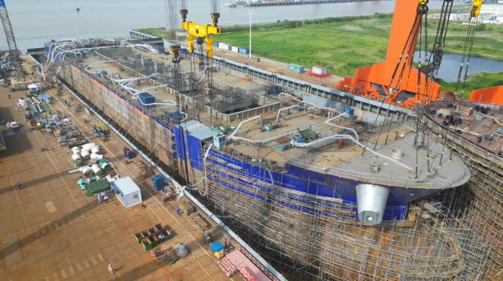 为实现主船体高质量贯通,中交广航局监造团队坚持高起点、高标准、全过程严控,围绕超大尺度精度控制、复杂应力分布处理、多系统协同集成、特殊材料焊接等重点难点问题,组织多轮联合技术攻关和专项评审,形成了一整套可复制、可推广的高效建造管理模式。施工过程中,项目团队与船厂通力协作,充分运用数字化扫描与三维定位联动系统,对关键分段开展“毫米级”误差补偿分析,精准制定吊装对接方案;在焊接工艺方面,严格执行高等级质量标准,优化焊接顺序,采用对称施焊工艺,显著降低残余应力,有效消除结构应力集中风险;在建造组织方面,推广模块化深度预舾装与区域化并行施工,打通工序衔接“堵点”,大幅提升建造效率,确保节点任务高效推进。
